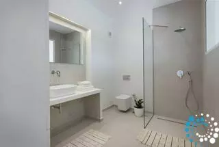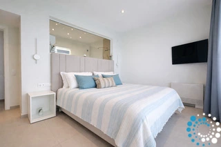 Inside, the villa is bright, elegant and minimalist in style. The open-plan living area features a sleek modern kitchen with island, a comfortable lounge with large sliding glass doors and a dining space that opens seamlessly onto the terrace, creating a wonderful indoor–outdoor flow. Four beautifully finished bedrooms, each with its own en-suite bathroom, offer comfort and privacy for up to eight guests.