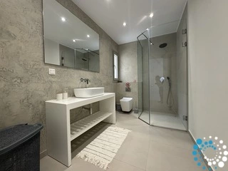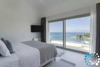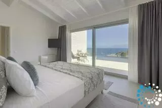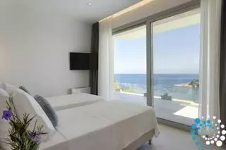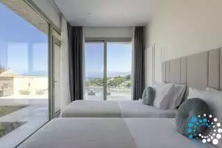 Behind the dining area, an opening leads to a vestibule where the first bedroom is located. This double-twin room includes a spacious en-suite shower room, captivating sea views and direct access to the main terrace. The ground floor also features a second double-twin bedroom accessed from the main terrace and the garden at the side of the house. This room offers a full glass wall, an en-suite shower room and beautiful sea views.