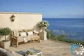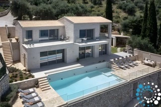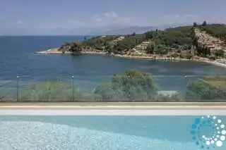 From the main entrance, steps ascend to the terraced gardens behind the house. Also accessible from the first-floor landing, this secluded area is framed by colourful flowerbeds, stone walls and olive trees swaying in the sea breeze. A table and chairs invite relaxed conversations over coffee or wine, while a covered pool table beneath the extended roof looks out toward the sea. The first-floor bedrooms arguably enjoy the most spectacular views thanks to their expansive panoramic terraces overlooking the sea, the headland and beaches of Kassiopi, and the mountains of Albania on the horizon. The outdoor areas are completed by the sloping gardens below the pool, landscaped with lawns and scattered olive trees.