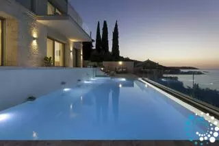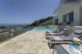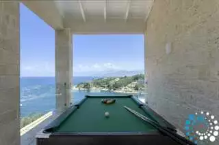 Outdoors, the villa unfolds across several landscaped terrace levels. Guests can relax on sun loungers beside the infinity pool, enjoy long alfresco meals prepared on the built-in barbecue and wood-fired oven, or unwind in one of the shaded lounge areas while taking in the hypnotic sea views. The upper gardens provide a quieter retreat with seating areas, olive trees and a covered pool table. Villa Lifestyle is ideal for guests who wish to combine a peaceful private setting and spectacular views with the convenience of being within walking distance of beaches, restaurants, shops and nightlife. It is a perfect choice for families or groups seeking a stylish villa close to the heart of one of Corfu’s most charming coastal towns.