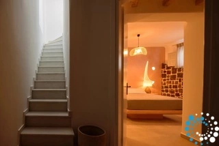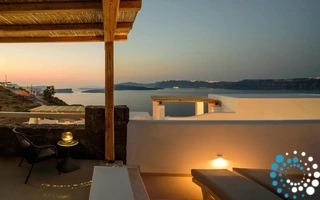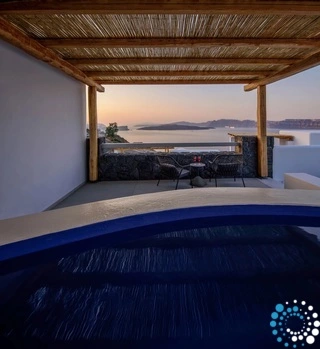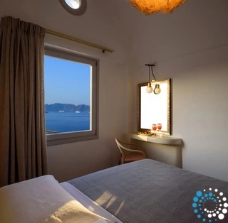 On the first floor there is a modern bedroom with a built bed where the guest wakes up admiring the enchanting Akrotiri Caldera. On the same floor there is a spacious beautiful balcony with a private heated jacuzzi overlooking the breathtaking Caldera.