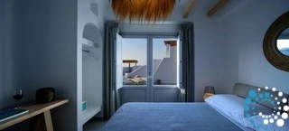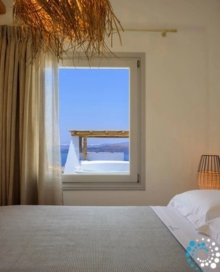 On the ground floor there is a large sitting room with two built sofas; it can be used as an inner relaxation space. There is also a kitchenette with all the necessary utensils for the preparation of a small meal. On the same floor there are two individual bedrooms with double beds. The first has a view to the magical Santorini volcano and the second to the lovely pool of the villa.
