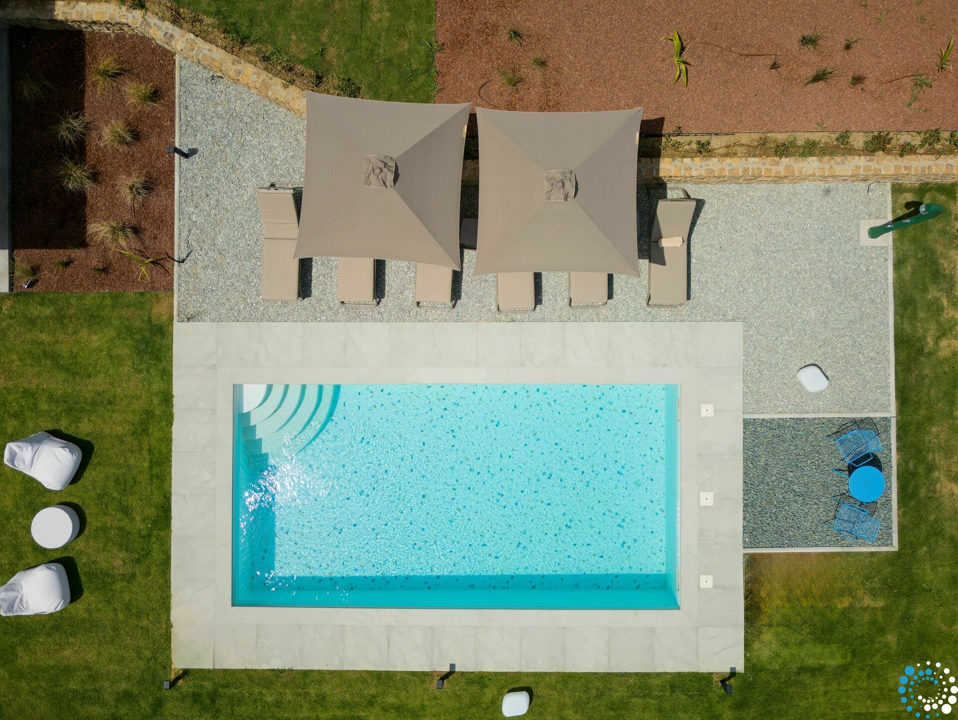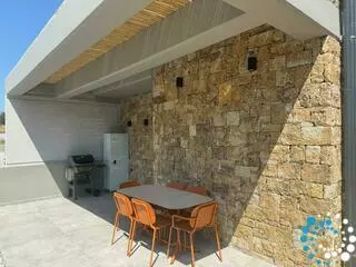 Its minimalist architecture enhances the spacious, light-filled interiors. The living room opens onto a sunny terrace with a private pool—perfect for enjoying the warm Mediterranean breeze. Two covered pergolas, one facing north and the other south, offer shaded spots throughout the day.