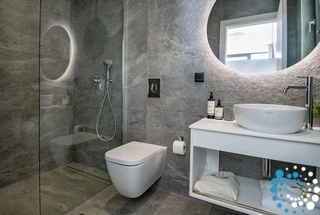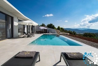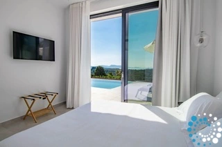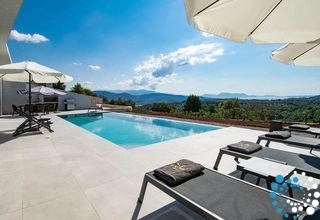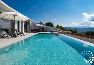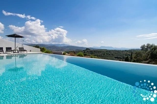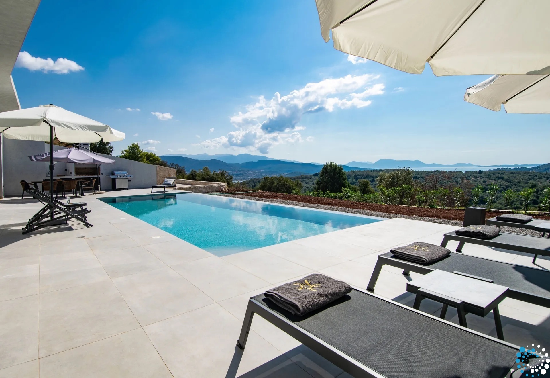 Step outside onto the expansive terrace and patio to take in breathtaking sea views from the comfort of your private heated saltwater infinity pool. The outdoor area includes a barbecue and a dedicated dining space, ideal for enjoying meals al fresco amidst the lush garden and panoramic mountain scenery.
