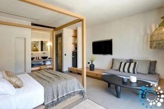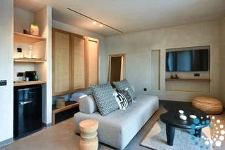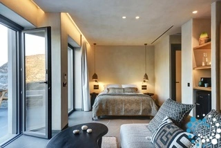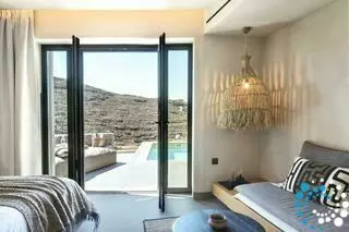 Wake up to the shimmer of the Aegean and unwind in beautifully appointed, air-conditioned rooms featuring walk-in showers, plush bathrobes, a coffee machine, and soundproofed serenity. Step onto the sun-drenched terrace, sip a refreshing drink at the bar, or relax by the stunning infinity-style pool with panoramic views of the sea. Free WiFi and convenient on-site and bicycle parking ensure a seamless stay.