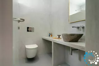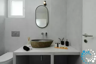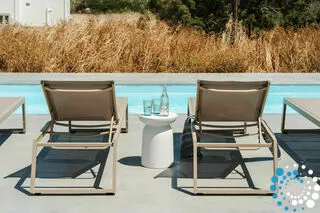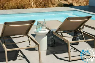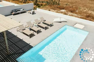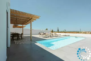 Outside, the villa offers a spacious private area designed for relaxation and enjoyment. A private swimming pool, comfortable sunbeds, a lounge corner and a dining table for six guests create an inviting outdoor setting perfect for peaceful mornings or warm evenings under the sky.