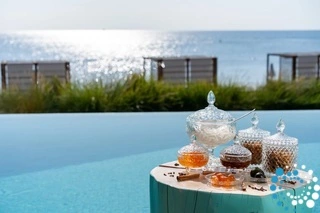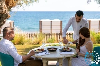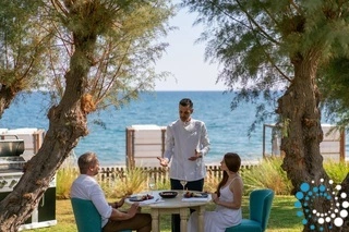 Guests enjoy exclusive access to the Executive Lounge, where they can start their day with breakfast, and enjoy coffee, pastries, soft drinks, and juices throughout the day. Breakfast can also be served in the privacy of your villa, or taken at the Main Restaurant, the Executive Lounge, or the Greek Taverna by the sea. The mini bar is fully restocked daily for your convenience. For added comfort, 24-hour room service is available, with extra charges applying.