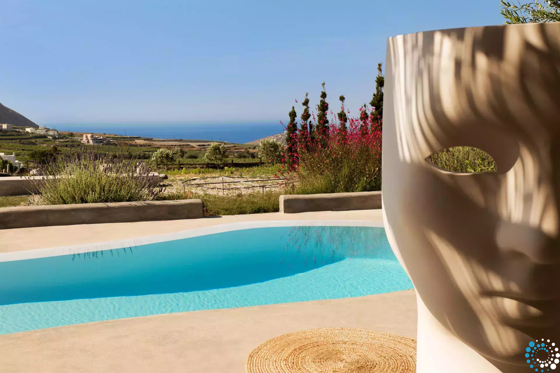The villa features a separate entrance to ensure maximum privacy and all the comforts of home to meet the needs of every guest. The private pools and outdoor sitting areas offer striking views of the island and the blue Aegean Sea. The layout of the complex allows the Estate to have its own privacy and the sense of an individual property. It promises absolute privacy and an unforgettable stay for those who seek to experience the authentic Santorinian island life with all modern comforts.