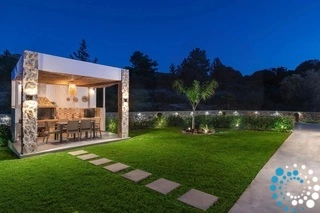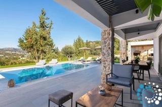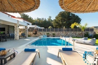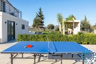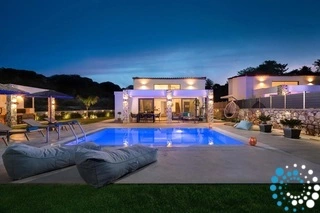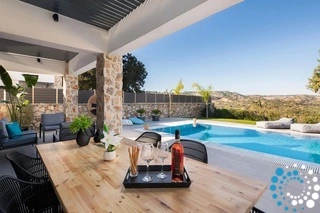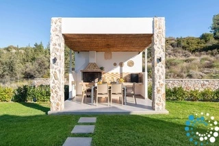 The interior seamlessly connects to a fully equipped open-plan kitchen and a cozy dining area, ideal for sharing meals and quality moments together. Outside, guests can unwind in a private swimming pool surrounded by sunbeds and a beautifully landscaped Mediterranean garden, offering a peaceful and refreshing environment. For outdoor gatherings, BBQ facilities are provided, and complimentary Wi-Fi is available throughout the property.