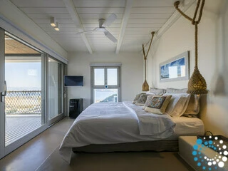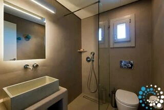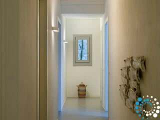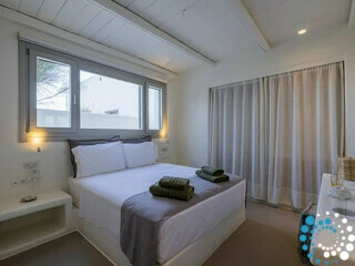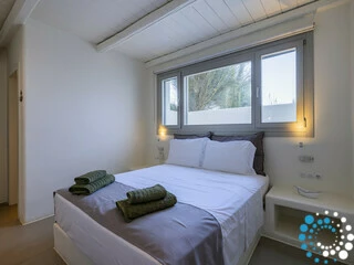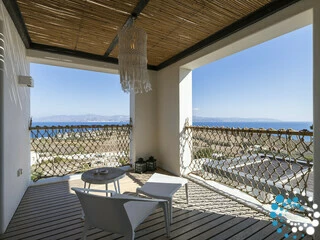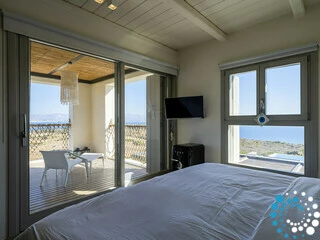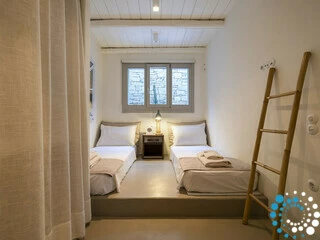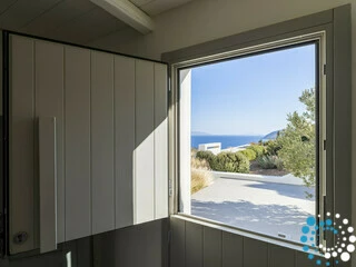 The upper level of the main house is dedicated to an elegant master suite featuring a large bathroom, walk-in closet, and a private wooden-deck balcony overlooking the Aegean. On the lower level, two additional master bedrooms each offer their own luxurious en-suite bathrooms, providing comfort and privacy for guests or family members.
