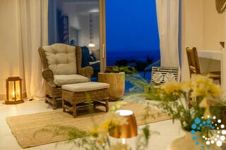 ExploreVilla Optiki is a stylish two-level retreat designed for comfort and relaxation, featuring a spacious terrace with sweeping views of the Aegean Sea and nearby islands.