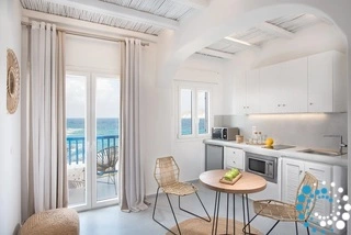 Each room opens onto a private patio or balcony with sweeping sea views, while the communal terrace frames breathtaking panoramas across the Aegean to neighboring islands. Dramatic white rock formations, reminiscent of the famous Sarakiniko, enhance the scenery, particularly during Milos’ unforgettable sunsets.