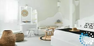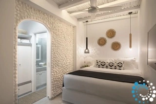 Designed in a modern Cycladic style, the complex blends seamlessly with Milos’ otherworldly, lunar-like terrain. Its architecture honors the island’s traditional charm while embracing contemporary comforts and elegant touches, creating a refined yet effortlessly relaxing atmosphere. Guests can unwind in cozy, thoughtfully appointed rooms, wander through lush gardens, or relax on the shared terrace—the perfect spot to take in the stunning surroundings.