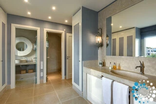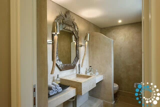 The lower level is dedicated to privacy and comfort, hosting five additional bedrooms, each furnished with queen-size beds and its own en-suite bathroom. This level also includes an additional WC with shower. Outdoors, guests can enjoy a true resort-style experience with a private swimming pool, lounge area with sunbeds, outdoor showers, a shaded dining space, a gas BBQ, and a stylish bar area—ideal for entertaining or unwinding throughout the day. Private parking ensures easy access and convenience.