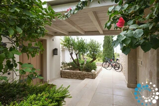 On the ground level, the villa opens into a spacious and inviting layout featuring a master bedroom with a king-size bed and en-suite bathroom with shower. The living room, dining area, and fully equipped modern kitchen flow seamlessly together, creating a bright and social heart of the home. A guest WC adds extra convenience. Outdoors, a large shaded veranda extends the living space, complete with comfortable seating and an alfresco dining area—perfect for long, leisurely meals in the warm Mediterranean air.