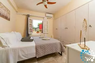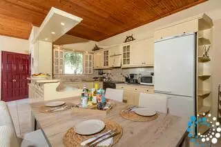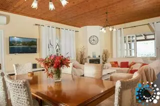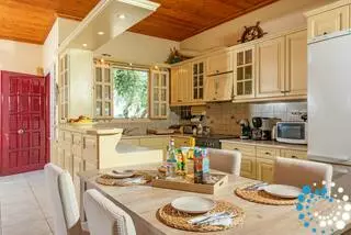 Inside, the villa offers 160 square meters of elegant Mediterranean living. The open-plan living area forms the heart of the home, featuring authentic wooden ceilings, comfortable blue sofas and a stylish dining area for six guests. French windows open onto the garden, allowing natural light to fill the space and creating a seamless connection between indoor and outdoor living.
