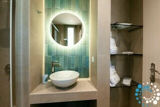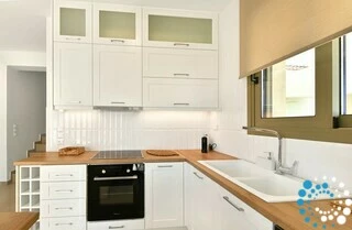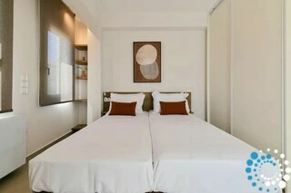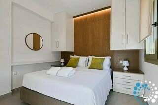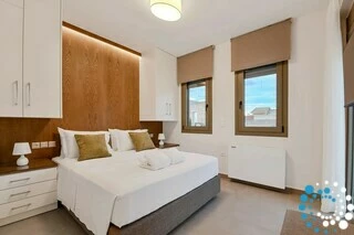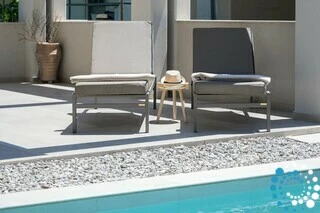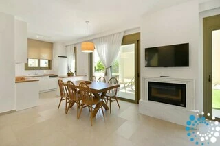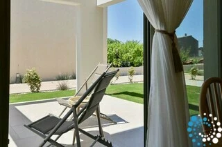 Each residence features a fully equipped kitchen, a dining area, and a spacious living room, complemented by three bedrooms and three bathrooms. Semi-outdoor living spaces, a private garden, and an individual swimming pool enhance the experience. Inside, the combination of wood, natural textures, and olive-hued accents creates a timeless elegance, brought to life by the warm, radiant light of the Ionian coast.