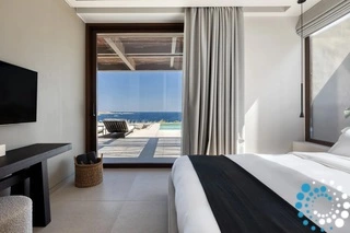 Each bedroom boasts king-size beds, premium linens, eco-friendly materials, and en-suite bathrooms with luxurious toiletries, soft robes, and spacious closets. Floor-to-ceiling windows showcase mesmerizing Aegean Sea views, immersing guests in pure serenity.