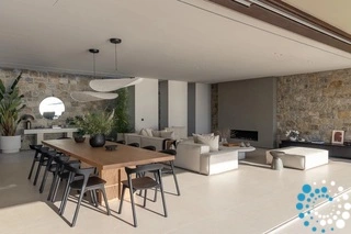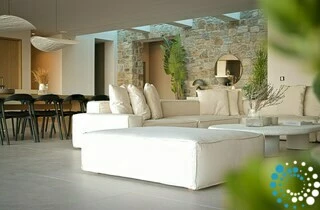Bask in the sunlit splendor of Villa Phaethon's expansive living room, a modern masterpiece designed to captivate and inspire. Floor-to-ceiling windows flood the space with natural light, accentuating the exquisite designer furniture and sleek finishes that create an atmosphere of sophistication and comfort.