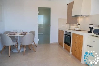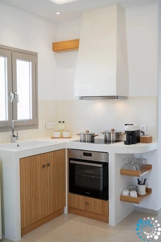 On the ground floor you will find a bright open-plan living and a dining area with a fully equipped kitchen, a built-in small sofa corner for relaxation, and a wc. On the upper floor, the villa features 1 bedroom with a double bed and en-suite bathroom and a private balcony with stunning views. On the lower floor, 1 bedroom with a double bed with en-suite bathroom and the laundry area with washing machine, ironing board & essentials.