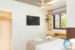 Villa Potamos offers two ensuite bedrooms designed for ultimate privacy and comfort. The master bedroom features a plush double bed, while the second bedroom provides two single beds that can be effortlessly transformed into a double, all with breathtaking sea views. The spacious living room and fully equipped kitchen combine functionality with minimalist luxury, ensuring a seamless and relaxing stay.