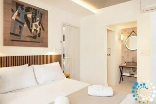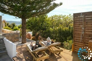 Step outside to your private outdoor oasis, where an expansive terrace invites indulgence and tranquility. A pergola-shaded lounge with a cozy sofa and dining area sets the perfect scene for leisurely meals, while a luxurious outdoor day bed offers a serene spot to unwind. The wooden sea-view platform, complete with an outdoor shower, lounge chairs, and sunbeds, provides a true haven for basking in the Mediterranean sun. With a private entrance and parking, Villa Potamos ensures both exclusivity and convenience.