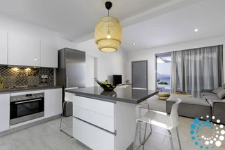 The fully equipped kitchen features modern appliances and large patio doors that flood the interior with natural light. Next to the kitchen, the stylish and spacious living area provides a comfortable place to unwind, offering views over the terrace, pool, and sea beyond. In the evenings, guests can relax on the plush sofas and enjoy a movie on the 40” satellite TV.