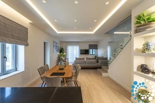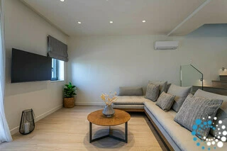 The ground floor features a spacious living area with a plush sofa bed that easily converts into a double bed, a fully equipped kitchen designed to meet all your needs, a modern bathroom, and a 50″ TV.