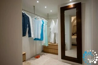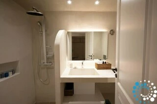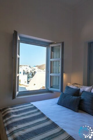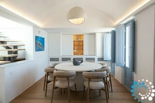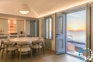The first floor of Villa Rodakini features two elegantly appointed en-suite bedrooms. One offers a luxurious 1.80-meter-wide bed, while the other has a comfortable 1.60-meter-wide bed, each accompanied by spa-style bathrooms with rainfall showers and high-pressure showerheads. A stylish guest WC adds extra convenience. The spacious living room provides the perfect spot to relax while taking in breathtaking views of Oia, the iconic blue domes, and the sparkling Aegean Sea. The dining area and fully equipped kitchen are complemented by a pantry for additional storage, ensuring both comfort and functionality.