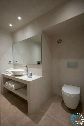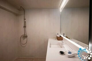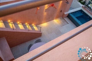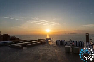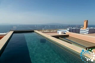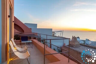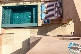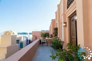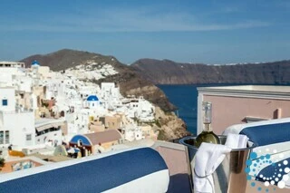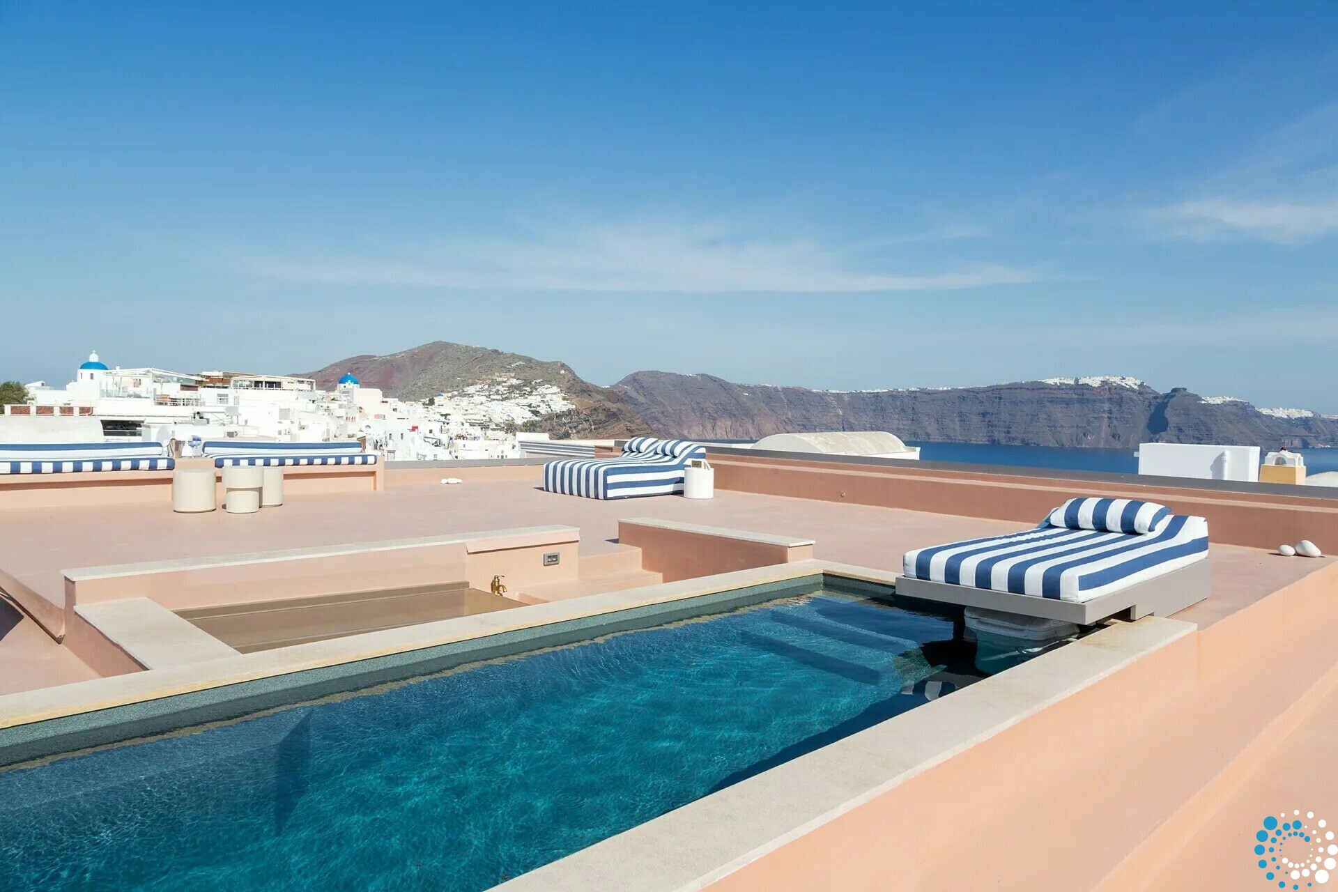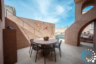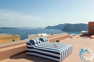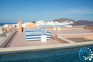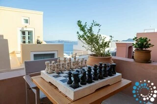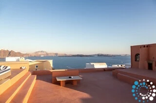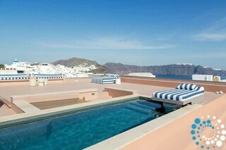 The rooftop offers the ultimate Santorini experience, boasting the highest vantage point in Oia with uninterrupted panoramic views of the entire island. A large swimming pool invites you to cool off while enjoying the scenery, and the area is designed for suntanning, sunset cocktails, and relaxation, featuring extra-large sunbeds and a lounge couch. A mini bar adds convenience, and an optional dining table allows for private rooftop dinners under the stars.