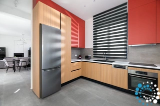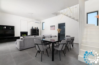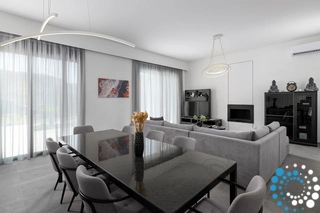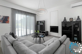 On the ground floor, sunlight streams through oversized windows, illuminating the bright and welcoming living area. Sink into the plush sofas by the fireplace, ideal for cozy evenings and relaxing movie nights. A modern dining area is ready to host intimate gatherings of up to eight guests, while the fully equipped kitchen is perfect for culinary adventures and provides direct access to the pool and barbecue area, creating seamless indoor-outdoor living.
