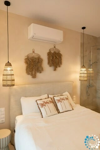 On the ground floor, you are welcomed by a bright living area with a comfortable seating corner, TV, Apple TV, Wi-Fi and air conditioning. The open kitchen is fully equipped with a fridge, freezer, oven, microwave, dishwasher, ceramic hob, coffee maker, kettle and toaster. There is a spacious dining table, a separate toilet and Bedroom 1 with a double bed, air conditioning, wardrobe and a modern bathroom with walk-in shower, washbasin, hairdryer, bath and beach towels.