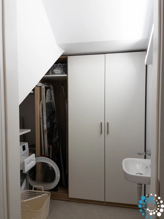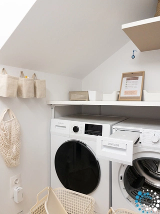 On the lower level (-1) there are three elegant bedrooms, each with air conditioning, wardrobes and a private bathroom. Bedroom 2 has a double bed and a bathroom with walk-in shower. Bedroom 3 has a double bed and an ensuite bathroom with walk-in shower. Bedroom 4 features two single beds and a pull-out bed for two additional sleeping places, ideal for children, along with an ensuite bathroom. There is also a separate toilet and a utility room with washing machine, dryer, drying rack, vacuum cleaner, iron and cleaning supplies. The private garden offers a second covered terrace and outdoor play equipment for children.
