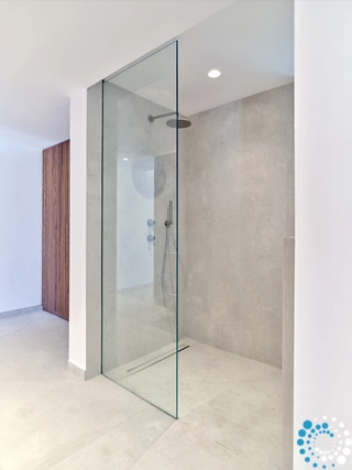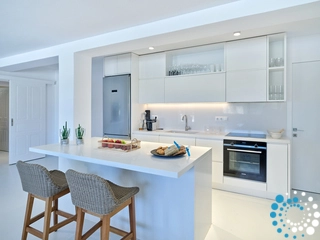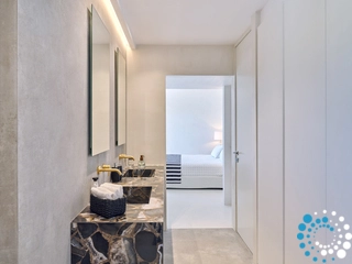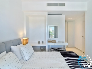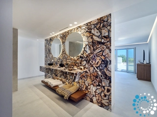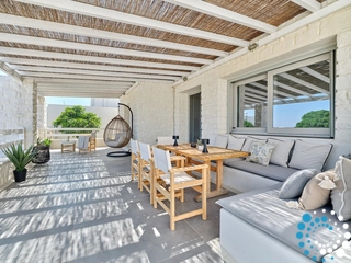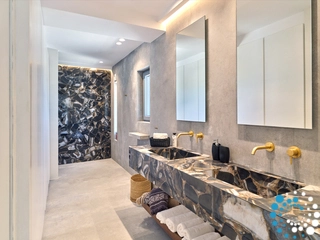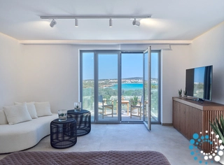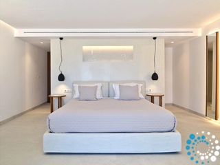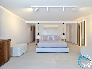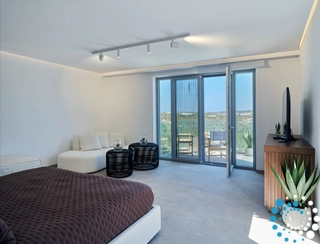 This property can comfortably accommodate 12 guests across 6 bedrooms. It spans 350 m² over three levels: entrance level, upper level and pool level. On the entrance level, there is an open‑plan living area that opens onto a spacious veranda with breathtaking sea views, and a master bedroom with en‑suite bathroom. The pool level features a cozy open‑plan living room with a fireplace, a fully equipped kitchen, a dining area, two double bedrooms sharing a bathroom, and a staff room. On the upper level there is another master bedroom with en‑suite bathroom and a private balcony with sea views.