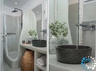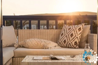 Crafted in a modern Cycladic style, the complex harmonizes beautifully with Milos’ otherworldly, lunar-like terrain. Its architecture respects traditional island charm while embracing contemporary comforts and elegant decorative touches, creating a refined yet effortlessly relaxing atmosphere. Guests can unwind in cozy, thoughtfully designed rooms, stroll through lush gardens, or lounge on the shared terrace, a perfect spot to soak in the surroundings.