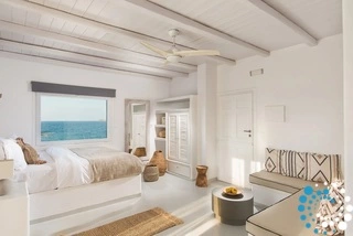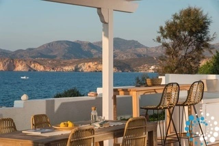 Every room opens onto a private patio or balcony with sweeping sea views, while the communal terrace frames breathtaking panoramas across the Aegean to the neighboring islands. Dramatic white rock formations—echoing the famous Sarakiniko—enhance the scenery, especially during Milos’ unforgettable sunsets.