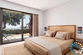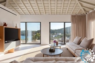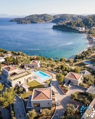 Located on the east coast of Skiathos in Achladies Bay, the villa sits in a charming Greek village with a traditional fishing-village feel. The sandy beach forms a small cove surrounded by lush greenery and crystal-clear waters. Just 2 km from Skiathos town, the area combines a tranquil setting with convenient access to restaurants, roads, and water taxis that can take you directly to the capital.