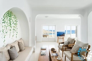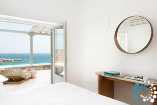 The villa is part of an exclusive collection of private seaside villas on the secluded beach at Glifadi in Mykonos. The world-class property is located on the Aleomandra peninsula on the elite southwestern shore of the island and a short distance from the fashionable beaches at Kapari, Ornos, and Psarou. The villa is only 4 km from Mykonos town, one of the world’s most cosmopolitan destinations packed with restaurants and nightlife. We are perfectly situated for honeymooners, globe-trotting families, and jetsetters making a glamorous escape.