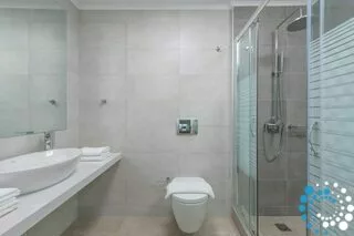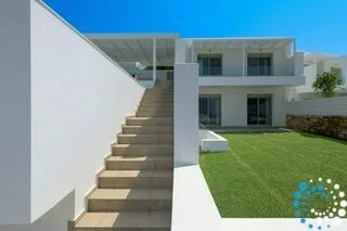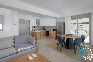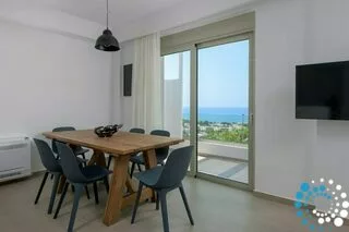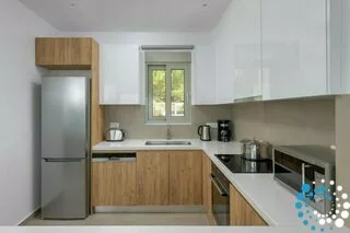 The villa comfortably hosts up to four guests in two beautifully designed bedrooms. On the lower level, two double bedrooms each feature their own en-suite bathroom, offering privacy and comfort. The upper level showcases an open-plan layout with a fully equipped kitchen, stylish dining area, welcoming living room, and a convenient guest W.C., all designed to enhance effortless holiday living.