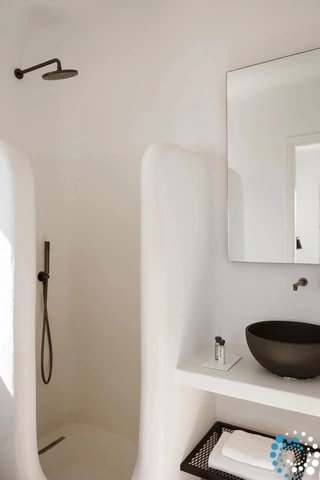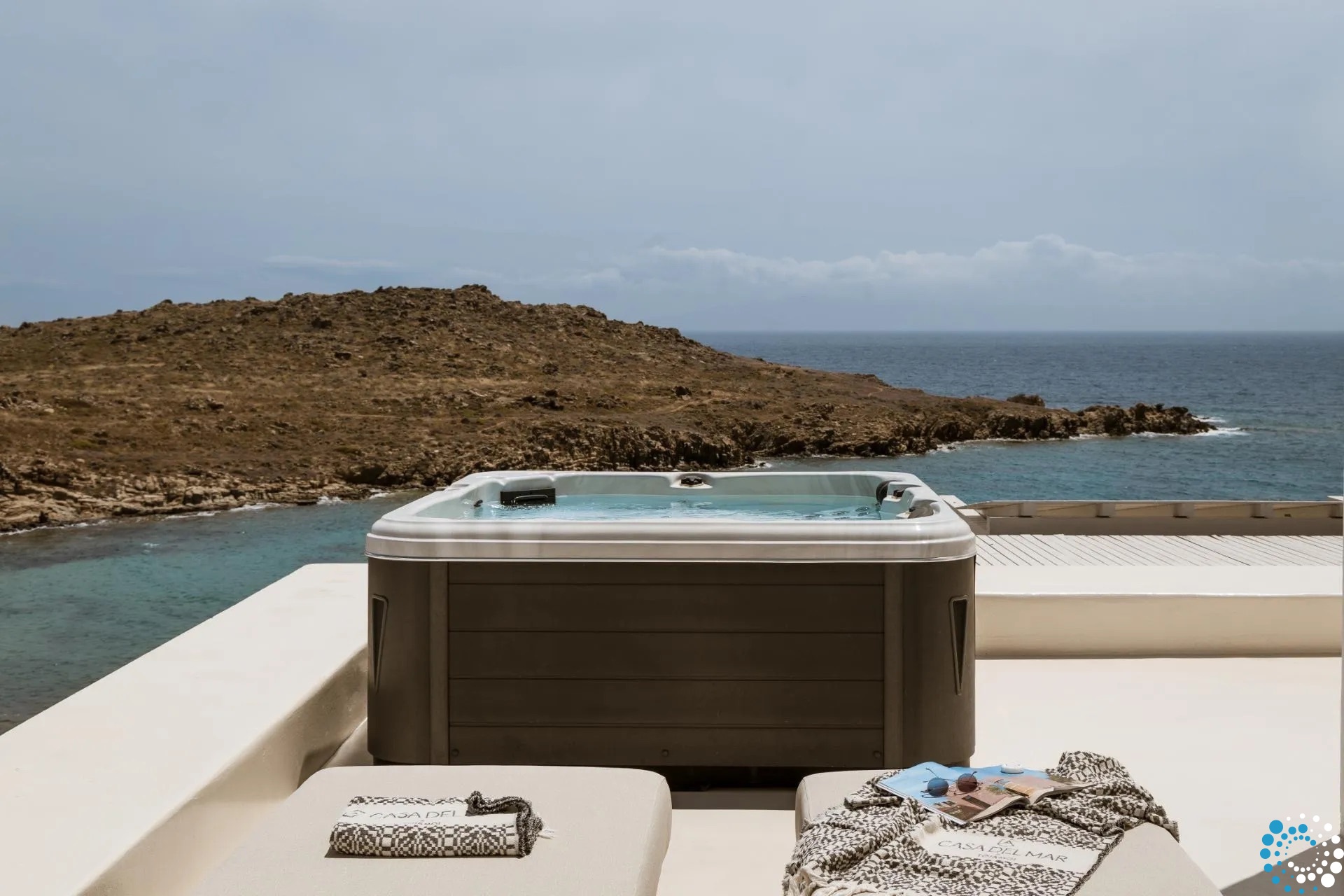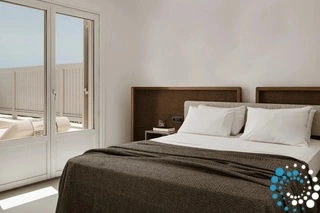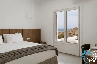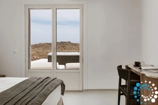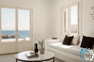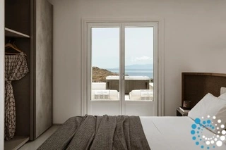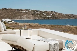 The Villa is part of a Seaside Resort lies on a private beach, a unique location, protected from the Mykonian wind, with a heavenly view to the Aegean and a picturesque sunrise, between the famous beaches of Ornos and Agios Ioannis, 4 km from Mykonos Town and the airport.
