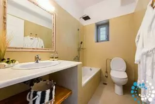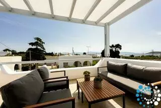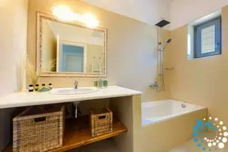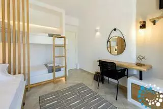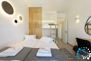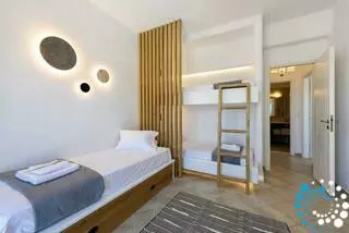 The first floor features 2 additional bedrooms — one with a double bed, and the other with a sofa/double bed plus a bunk bed — along with a stylish bathroom and a private terrace. All bedrooms and living areas are air-conditioned for your ultimate comfort.
