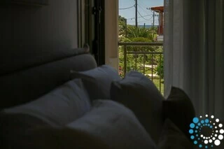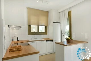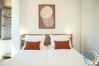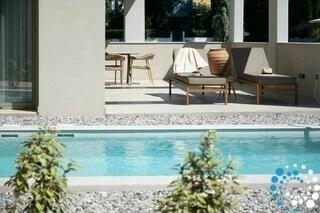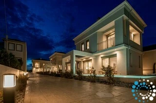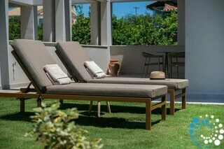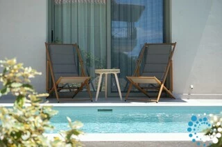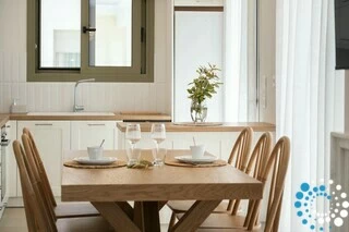 Each villa offers a fully equipped kitchen, a dining area, and a spacious living room, along with three bedrooms and three bathrooms. Semi-outdoor spaces, a private garden, and an individual swimming pool complete the setting. The interiors blend wood, natural materials, and olive-toned hues, creating a timeless elegance enriched by the warm, radiant light of the Ionian coast.