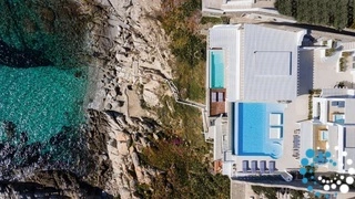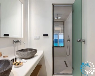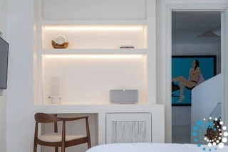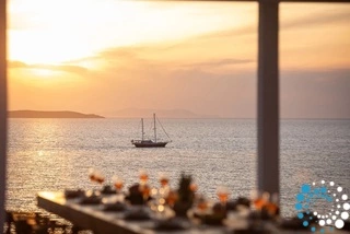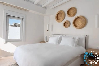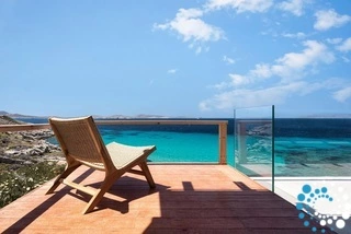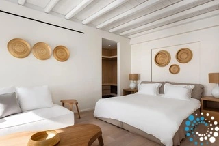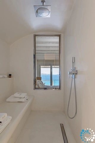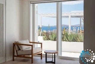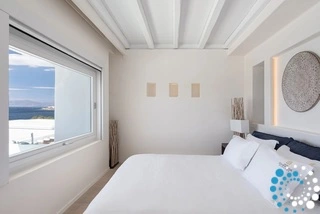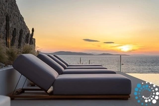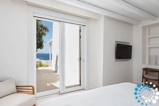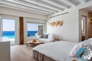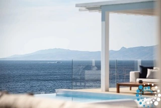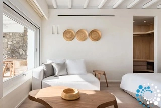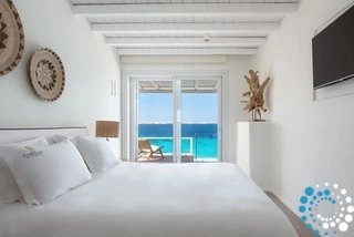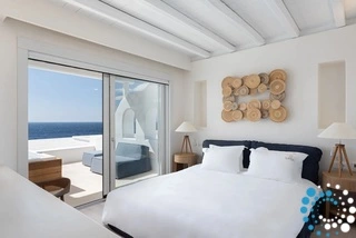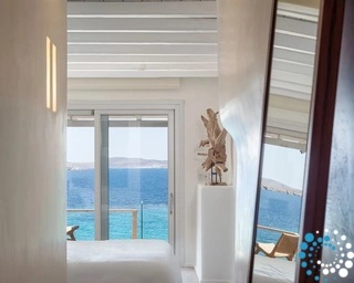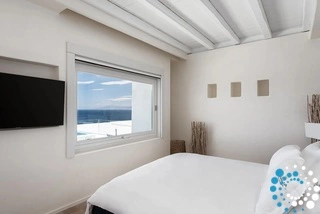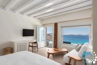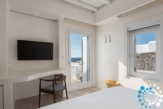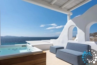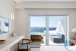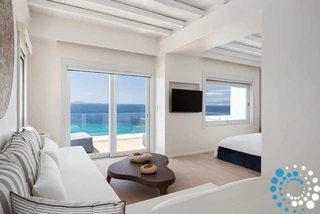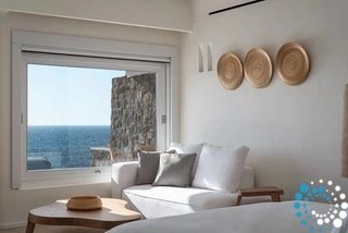 The top-floor suites each feature their own indulgent jacuzzi, and one even has a private terrace. Large windows and glass doors flood the rooms with natural light, offering a spectacular wake-up view. From here, the seemingly endless blue of the Aegean and the brilliant Greek sky create an unforgettable panorama—ideal for sipping champagne as the sun casts golden hues across the sea at sunset.