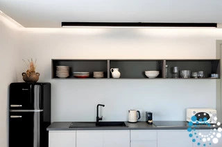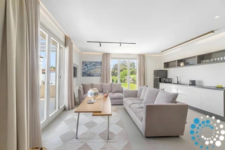 The villa features two spacious master bedrooms, each equipped with luxury king-sized beds and marble en suite bathrooms, accommodating up to four guests. Its interior boasts an open-plan layout including a stylish living area with streamlined designer furniture, a dining space, and a fully equipped kitchen featuring premium appliances from brands like Smeg and Nespresso.