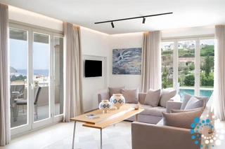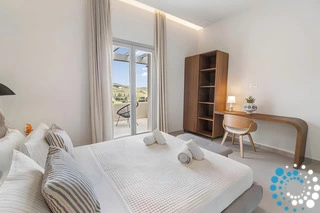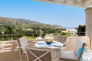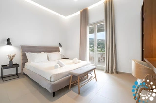 Large windows with mosquito nets frame breathtaking panoramic views of the surrounding valleys and the Aegean Sea, leading out to an extensive terrace.