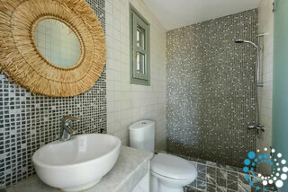 Accommodating up to eight guests, the sleeping arrangements include a master bedroom with a king-size bed, two additional bedrooms each with a king-size bed and a single bed, and a guest house studio that offers a king-size bed along with two single beds. Each bedroom comes with its own en-suite bathroom, while the master suite includes a separate WC for added convenience.