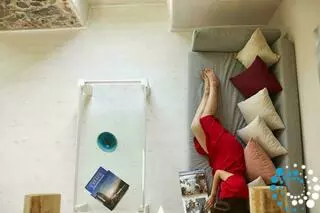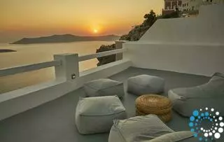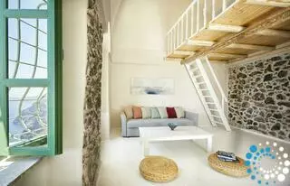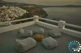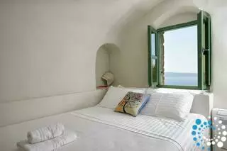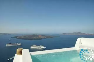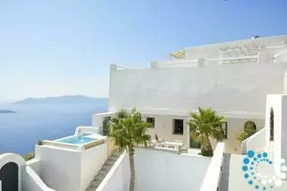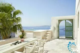 The villa features 170 square meters of internal space and 200 square meters of terraces and balconies overlooking the Caldera. It includes four double rooms with king or queen-size beds and four fully equipped bathrooms. There are two kitchens, one fully equipped and a smaller one with a dining area, as well as two living rooms with sofa beds that can accommodate an additional four to six guests. The small infinity heated pool offers a relaxing bubble water jet massage system, and the outdoor yard has a table that seats twelve. Terraces and balconies are furnished with tables, chairs, and sunbeds, providing the perfect setting to enjoy the spectacular views.