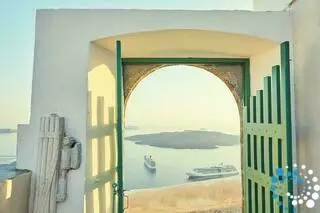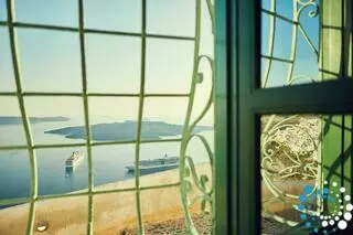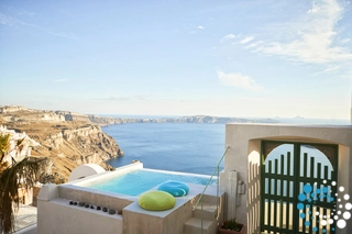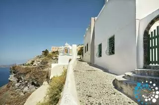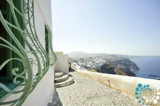 Positioned 300 meters above sea level, the property offers unobstructed views of the Santorini volcano, the magical Caldera, and the town of Fira. The yard and pool are slightly elevated above the cobbled path, ensuring privacy from passersby. This exceptional location is one of the most photographed spots in Santorini, yet it is only a five-minute walk from the town center.