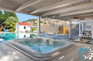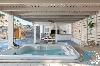 Outside, Villa Xantho boasts a private swimming pool with sunbeds and a soothing Jacuzzi, perfect for basking under the Aegean sun. Children can enjoy the playground, while adults relax or gather with loved ones at the BBQ and outdoor seating area.