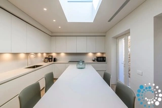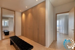 Upon entering the main level, guests are greeted by a spacious, contemporary living room, awash with natural light and panoramic sea views of the bustling harbor of Tourlos. The minimalist kitchen - an island of culinary delight - sits under a breathtaking skylight that paints a dance of sunlight across the room. This level also features a luxuriously appointed bedroom with an outsized dressing room and a spacious bathroom. The bedroom is accompanied by a gym and has its own private veranda with inspiring views.